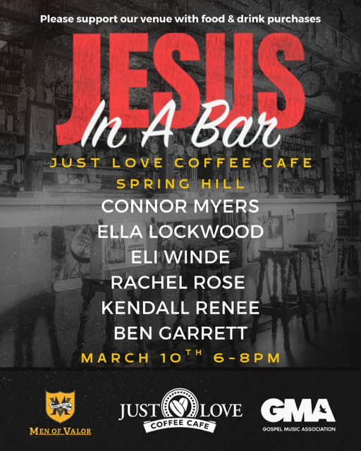 Join us for Jesus In A Bar where six incredibly talented singer/songwriters will be sharing their original songs and the stories behind them. Doors open at 5:30pm, event starts at 6pm. Come early to order food & beverages. No cover charge.