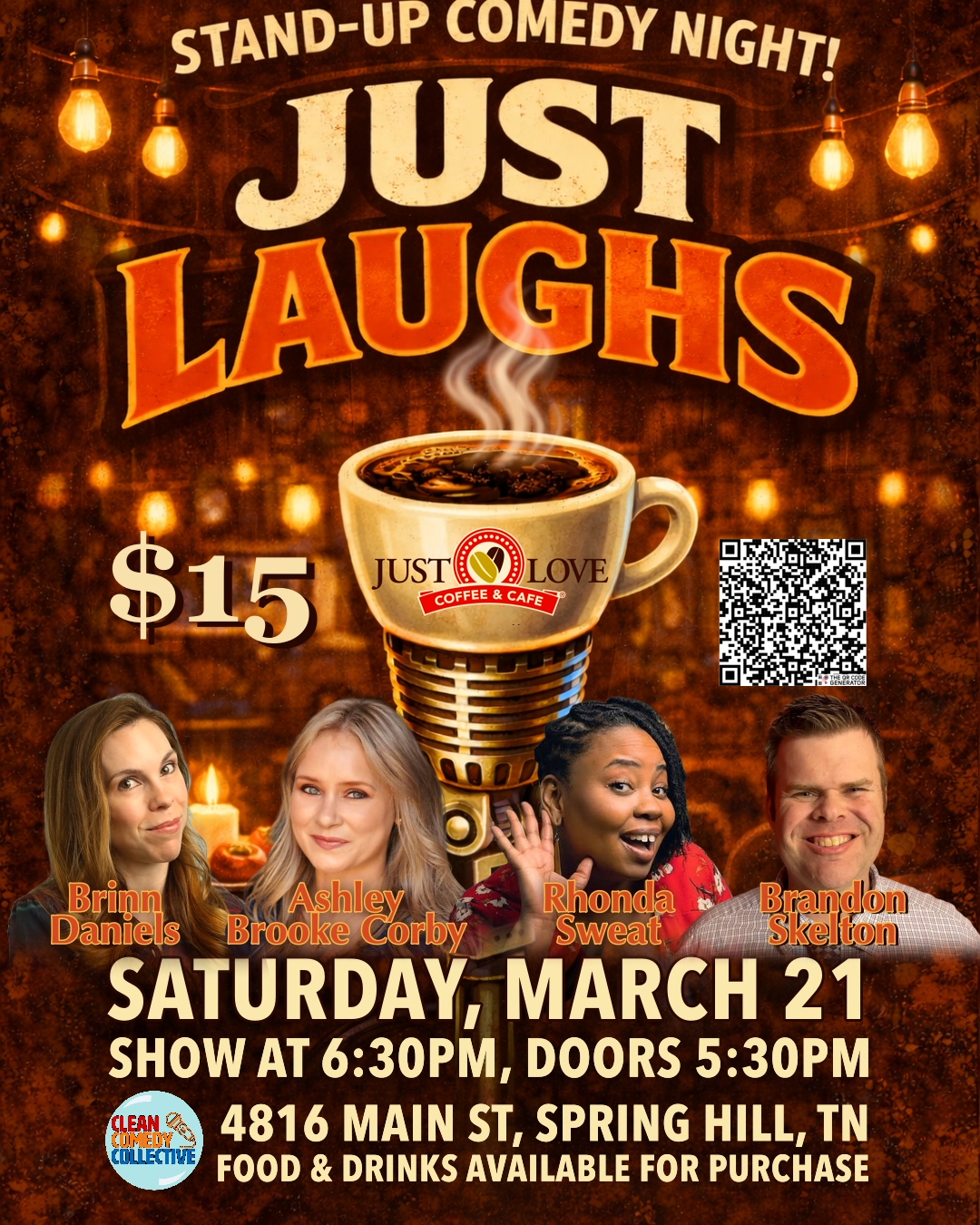 Join us for a night of food, beverages and laughs! Presented by the Clean Comedy Collective. Doors open at 5:30PM, event starts at 6:30PM. Come early to grab dinner and beverages before the show.